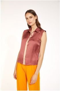Ärmellose Hemdbluse aus Viskose-Satin mit leichter kontrastierender Paspel an der Knopfleiste