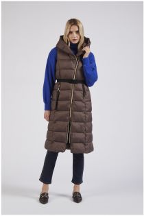 Wattierte gesteppte weste mit warmer kuscheliger kapuze. der elastische gürtel definiert die taille.