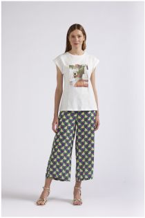 Ärmelloses t-shirt aus stretch-baumwolljersey. der mit strasssteinen verzierte aufdruck zeigt die büste einer frau die eine strickjacke und shorts trägt.