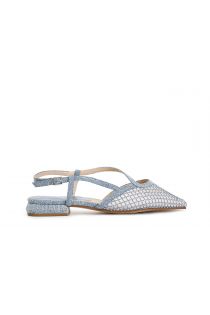 Ballerinas aus jeans hinten offen mit riemchen und asymmetrischem ausschnitt. charakteristisch ist das mit strass verzierte netz. 15 mm hoher denim-absatz.