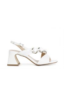 Sandalen mit asymmetrischem schaft aus leder und accessoire mit drei kugeln. ein schuh der dank seines 55 mm hohen breiten absatzes und seines bequemen fußes den ganzen tag lang getragen werden kann.