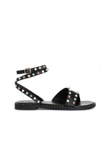 Asymmetrische ledersandalen mit schnürung und cabochon. futter und innensohle sind aus leder. der absatz ist 2 cm hoch. angenehm zu tragen und einfach zu kombinieren.