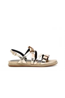 Asymmetrische Sandalen mit Accessoires in eckiger Form aus Metall in demselben Farbton wie der Oberschuh. Besonderes Detail: der mit Glitter besetzte, abgeschrägte Rahmen.