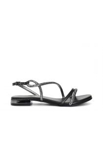 Asymmetrische sandalen mit heißversiegelten strasssteinen. futter und innensohle sind aus leder. der absatz beträgt 1.6 cm.