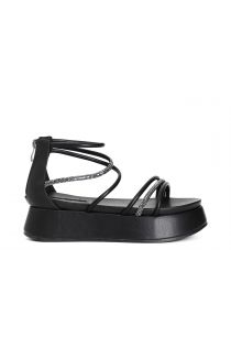 Asymmetrische sandalen mit mignons und strasssteinen. reißverschluss auf der rückseite. 3.5 cm hoher keil