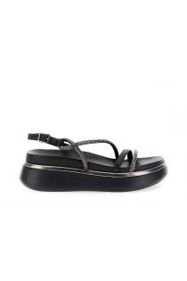 Sandalen mit dünnen mit strasssteinen besetzten riemchen einem verstellbaren riemen und einer leichten plateausohle mit metallic-besatz. 3 cm plateau 4 cm sohlenhöhe. ein bequemes und glamouröses modell perfekt für sommerliche looks mit minimalistischer eleganz.