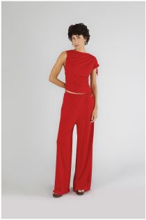 Elegantes asymmetrisches ärmelloses top aus superstretch-stoff mit kordelzug an der schulter und drapierung an der seite.
