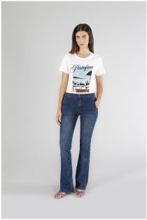 Jeansmodell „anna“ mit ausgestellter passform. aus superstretch-canvas. das kleidungsstück soll die figur umhüllen und die form betonen. fünf taschen klassischer verschluss und gürtelschlaufen.