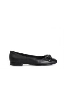 Ballerina aus leder mit schleife und nieten. 15 mm hoher bezogener absatz. das futter und die innensohle sind aus leder.