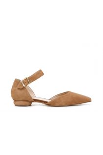 Ballerinas aus Rauleder mit Knöchelriemchen und schlankem Vorderschuh. Flacher, mit demselben Material wie der Oberschuh bezogener Absatz