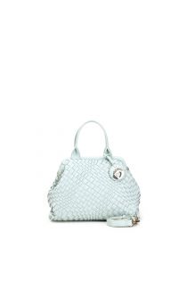 Bauletto-Tasche mit Schnappverschluss, verziert durch ein Flechtmuster unregelmäßiger Größe und röhrenförmige Griffe. Personalisierter Anhänger