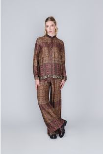 Bedruckte Bluse aus Viskose-Satin mit Stehkragen und langen Ärmeln. Kragen und Manschetten mit exklusivem Print in Kontrastfarbe. Normale Passform. Das Model ist 174 cm groß und trägt Größe S.