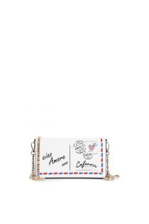 Damen-clutch mit postkarten-print goldkette und vintage-details. perfekt um ihrem lässigen oder eleganten look eine einzigartige und romantische note zu verleihen.