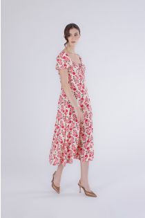 Bedrucktes wadenlanges viskosekleid mit kurzen ärmeln zartem ausschnitt und elastischem bund. der geraffte rücken betont die silhouette und sorgt für bequemen und stilvollen tragekomfort – ideal für elegante sommer-looks. das model ist 171 cm groß und trägt größe s. passform: normal.