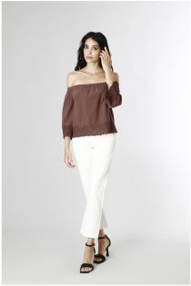 Baumwollbluse mit stickerei am abschluss und an den ärmeln. großer u-boot-ausschnitt.