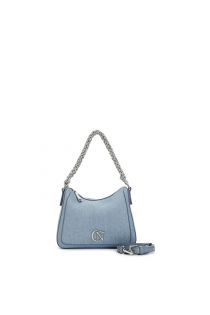 Denim-beuteltasche mit gewebtem mignon-griff und strasssteinen. metall-logo. verschluss mit reißverschluss. tasche mit schulterriemen.