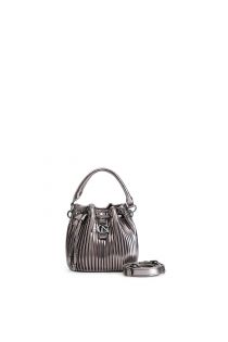 Beuteltasche mit kordelzug aus plissiertem metallmaterial mit logodetail aus metall mit strasssteinen. abnehmbarer schultergurt.