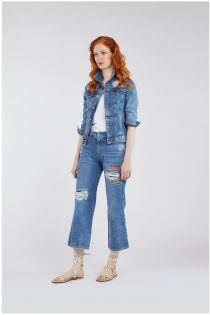 Blousonjacke aus festem Denim-Gewebe, verziert mit einer mehrfarbigen Stickerei, einer Knopfleiste vorn und Täschchen. Klassisches Modell aus Denim mit einzigartigen, unverwechselbaren dekorativen Varianten: die Ikone der CafèNoir Jeans-Linie.