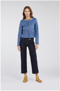 Kurze Blousonjacke aus Lederimitat mit bedrucktem Futter, durch spezielle Schnittnähte verziert, die der Mitte vorn und dem Rückenteil Form geben.