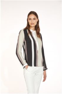 Bluse aus bedrucktem Viskose-Marocain mit weitem, mit Kontrastrand gefasstem Ausschnitt. Lange Ärmel mit leichter Kräuselung am Abschluss.
