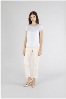 Kurzarmbluse mit überschnittener schulter aus viskosesatin. detail mit rippe und lurex um den halsausschnitt zu vervollständigen. die bluse eignet sich perfekt als unterjacke zum kombinieren mit anzügen und anzügen.