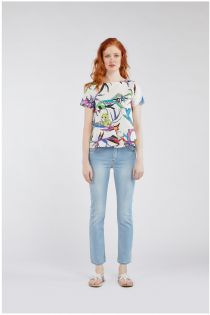 Bluse mit Ärmeln in halber Länge und Volants aus bedrucktem Stoff mit abgerundetem Halsausschnitt. In drei exklusiven Druckmustern erhältlich.