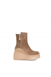 Boots aus Rauleder mit Metallreißverschlüssen. Sohle mit Keilabsatz, der durch ein erhabenes Logo die Blicke auf sich zieht