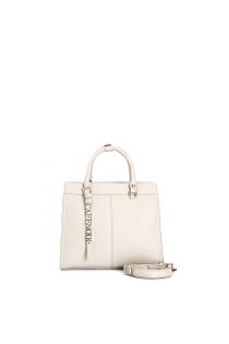 Elegante handtasche aus material mit feiner maserung röhrenförmigen henkeln mit raffinierter applikation aus goldenem metallschriftzug. komplett mit abnehmbarem schultergurt für zusätzliche vielseitigkeit.