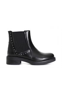 Damenstiefelette aus gebürstetem kunstleder mit gummizug an der seite des schafts für ein leichteres anziehen. das ganze wird durch verchromte mikro-nieten verschönert. die innensohle ist aus leder gefertigt.