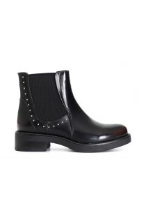 Damenstiefelette aus gebürstetem kunstleder mit gummizug an der seite des schafts für ein leichteres anziehen. das ganze wird durch verchromte mikro-nieten verschönert. die innensohle ist aus leder gefertigt.