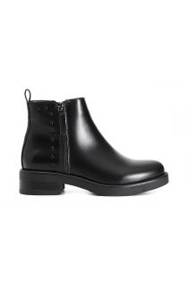 Damenstiefelette aus gebürstetem kunstleder mit seitlichem reißverschluss komplett mit nieten verziert. die innensohle ist aus leder gefertigt.