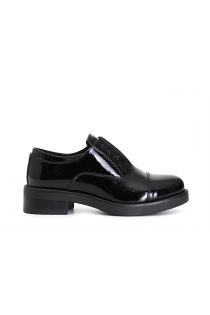 Damenstiefelette aus lackleder mit gummiband ind der mitte und nieten. die innensohle ist aus leder gefertigt.