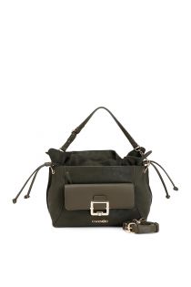 Bucket-Bag aus zwei Materialien, Tasche an der Vorderseite und Metallschnalle zum Verschließen