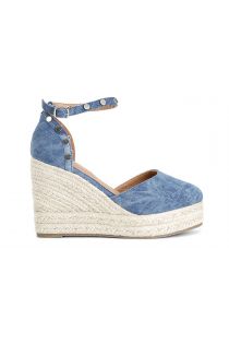 Canvas-sandalen mit 10.5-cm-seilkeil und 3.5-cm-plateau. knöchelriemen. innensohle aus leder. schuh vorne und hinten geschlossen. goldene nieten oben und am riemen.