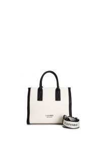 Tasche mit röhrenförmigen henkeln aus natürlichem canvas und kontrastierenden profilen. logos aus kunststoff und verstellbarer schultergurt. offene gesäßtasche und emaillierte logo-nieten.