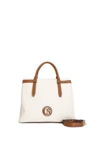 canvas-tasche mit röhrenförmigen henkeln, kontrastierendem logo und abnehmbarem schultergurt natural