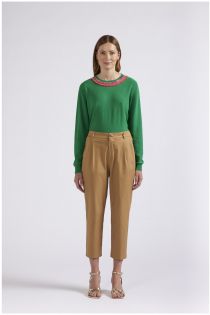 Moderne bequeme chino-hose mit abnähern. hergestellt aus stretch-baumwolle. abnäher auf der vorderseite und ein gummizug auf der rückseite der taille erhöhen den komfort. seitentaschen reißverschluss und knopfverschluss.