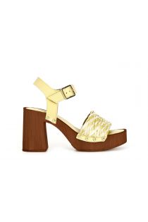 Clogs mit holzabsatz und dekorativem zweifarbigem riemen aus geflochtenem raffiabast.