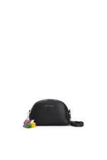 Clutch bag mit abnehmbarem farbigem anhänger. tasche mit verstellbarem schultergurt. die tasche wird mit einem reißverschluss geschlossen.