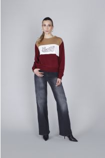 Farbblock-Pullover mit Rundhalsausschnitt aus warmem Wollmischgarn und Strass-verziertem „Sportif“-Schriftzug. Ein lässiges, farbenfrohes Teil, perfekt für bequeme und gleichzeitig ausdrucksstarke Looks. Das Model ist 173 cm groß und trägt Größe S.