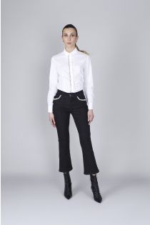 Cropped-Jeans mit ausgestelltem Bein aus Superstretch-Denim und Strass-verzierten Taschen. Ein lässiges, farbenfrohes Design, das die Figur vorteilhaft betont und dabei Komfort und Stil vereint. Das Model ist 173 cm groß und trägt Größe S.