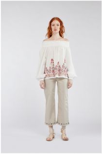 Culotte-Hose aus Baumwoll-Stretch-Satinella. Eine dezente Applikationen aus kleinen Perlen-Posamenten ziert den Beinabschluss.