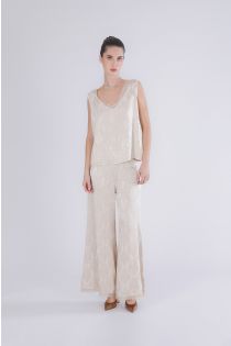 Ärmelloses tanktop mit v-ausschnitt aus damast-viskose-satin mit offener saumkante am ausschnitt. die fließende silhouette und die bequeme passform machen es ideal für elegante tages- und abend-looks. passt perfekt zu weit geschnittenen hosen oder jeans. das model ist 175 cm groß und trägt größe s. passform: normal.