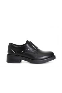 Damen-derby-schuh aus gebürstetem kunstleder mit gummizug und verchromten mikro-nieten. die innensohle ist aus leder gefertigt.