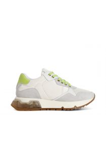 Weiße damen-laufschuh aus nylon und wildleder. farbiger kragen und farbige schnürsenkel.