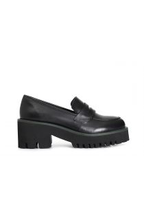 Damen-ledermokassin mit schwarzer sohle und farbigem rahmen. 60 mm hohe tanksohle und 30 mm plateau. das futter und die innensohle sind aus leder.