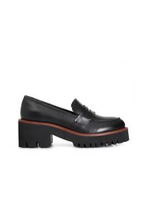 Damen-ledermokassin mit schwarzer sohle und farbigem rahmen. 60 mm hohe tanksohle und 30 mm plateau. das futter und die innensohle sind aus leder.