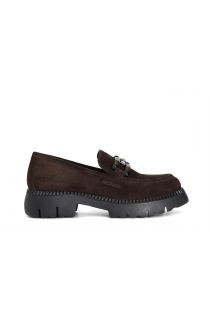 Damen-mokassin aus wildleder mit horsebit. futter und innensohle sind aus leder. 25 mm hohes plateau. 40 mm absatz.