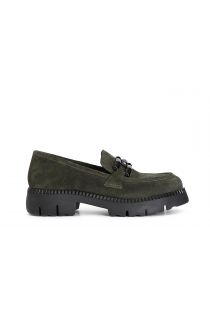 Damen-mokassin aus wildleder mit horsebit. futter und innensohle sind aus leder. 25 mm hohes plateau. 40 mm absatz.