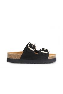 Damen-slipper aus leder mit doppelschnalle. bequemes 4 cm hohes fußbett aus leder.